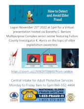 Logon November 23rd 2022 at 1pm for a Virtual presentation hosted via Dorothy C. Benson Multipurpose Complex senior center featuring Fulton County Investigator K. Harris on the topic of elder exploitation awareness.